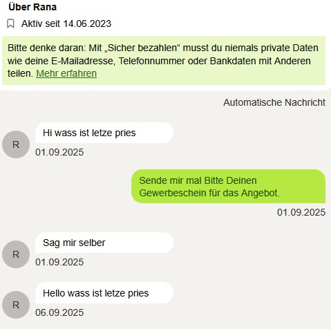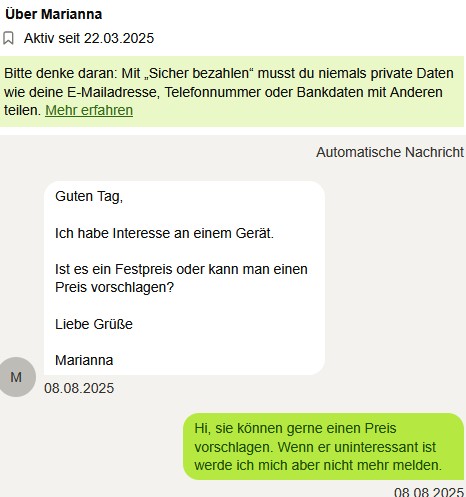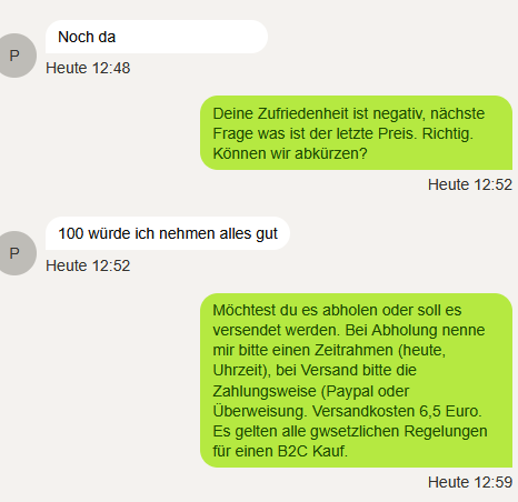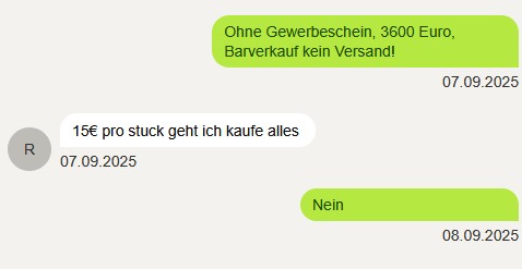 Kunde möchte einen größeren Posten kaufen. Denkt wohl ich mache Spass, als ich nach dem Gewerbeschein frage. Angebot ist ausgewiesen als „Verkauf nur an Gewerbetreibende“. Dann kommt noch ein unverschämtes Preisangebot von unter 50 Prozent pro ursprünglichen Gerätepreis, als ich ihn auch als Privatkäufer akzeptiere.